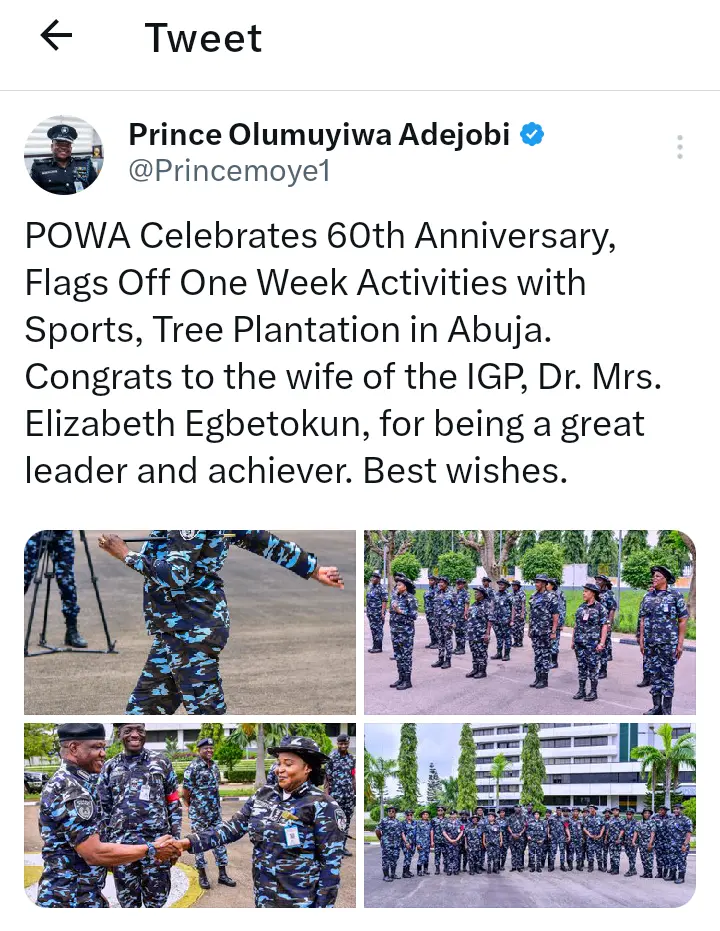 Sharing photo of the Inspector General of Police wife, Elizabeth Egbetokun commanding parade while wearing a Nigerian Police Force uniform with rank, the Nigerian Police Force Public Relations Officer FPRO, Prince Olumuyiwa Adejobi tweeted: “POWA Celebrates 60th Anniversary, Flags Off One week activities with Sports, Tree plantation in Abuja…”