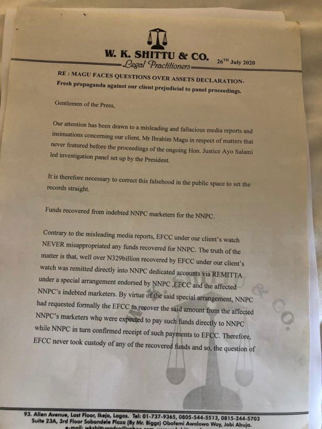 Mr Magu’s lawyer, Wahab Shittu in a statement said the EFCC under Mr Magu’s watch never misappropriated any funds recovered for the Nigerian National Petroleum Corporation (NNPC), describing such reports as false.