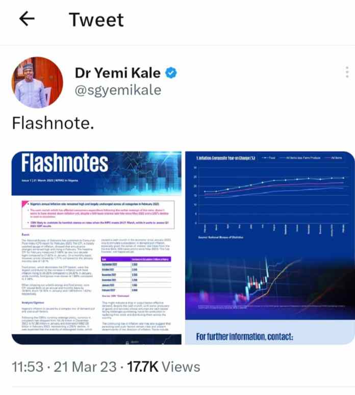 According to the document, signed by Dr Yemi Kale, Partner/Chief Economist at KPMG and former Statistician General at the National Bureau of Statistics (NBS), “following the CBN’s currency redesigning policy, currency in circulation dropped from N3.28 trillion in December 2022 to N1.38 trillion in January 2023 and estimated N982.09 billion in February, representing 235 percent decline.